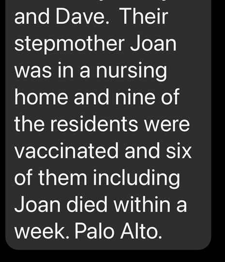 My mother also was in an assisted living facility and between the first vaccine "party" and the second one, 8 residents died. Two more, including my mother, died two weeks after that. My mother was deathly ill after the shot, eventually fell and broke her back.....horrible. My mother-in-law got jabbed, had a horrible shingles outbreak, felt horrible and was having neurological uncontrollable shaking. On the way to the urgent care, she crossed the road and had a head on collision - on the same day my mom passed. She died 5 days later. I know about 30 other people who have had serious side effects, paralysis, vertigo, cancer, strokes, and death. They are trying to kill us.