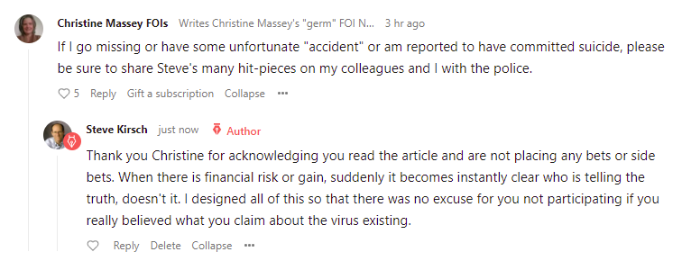 While these bets don’t definitively resolve issues, at a minimum they will make one side $1M richer and the other side $1M poorer. This will discourage people from making the same claims in the future. For example, if Sam Bailey loses $1M in a bet about virology existing, she’s less likely to keep making the same claim in the future. This is similar to the 100,000 Euro offer made by Stefan Lanka. It proves a point about who is confident in their beliefs. I see that since he lost on the merits in the lower court, Stefan Lanka has not subsequently extended a similar offer which is a tacit admission that he would lose. Did you notice that too? Money has a way of creating finality on an issue.