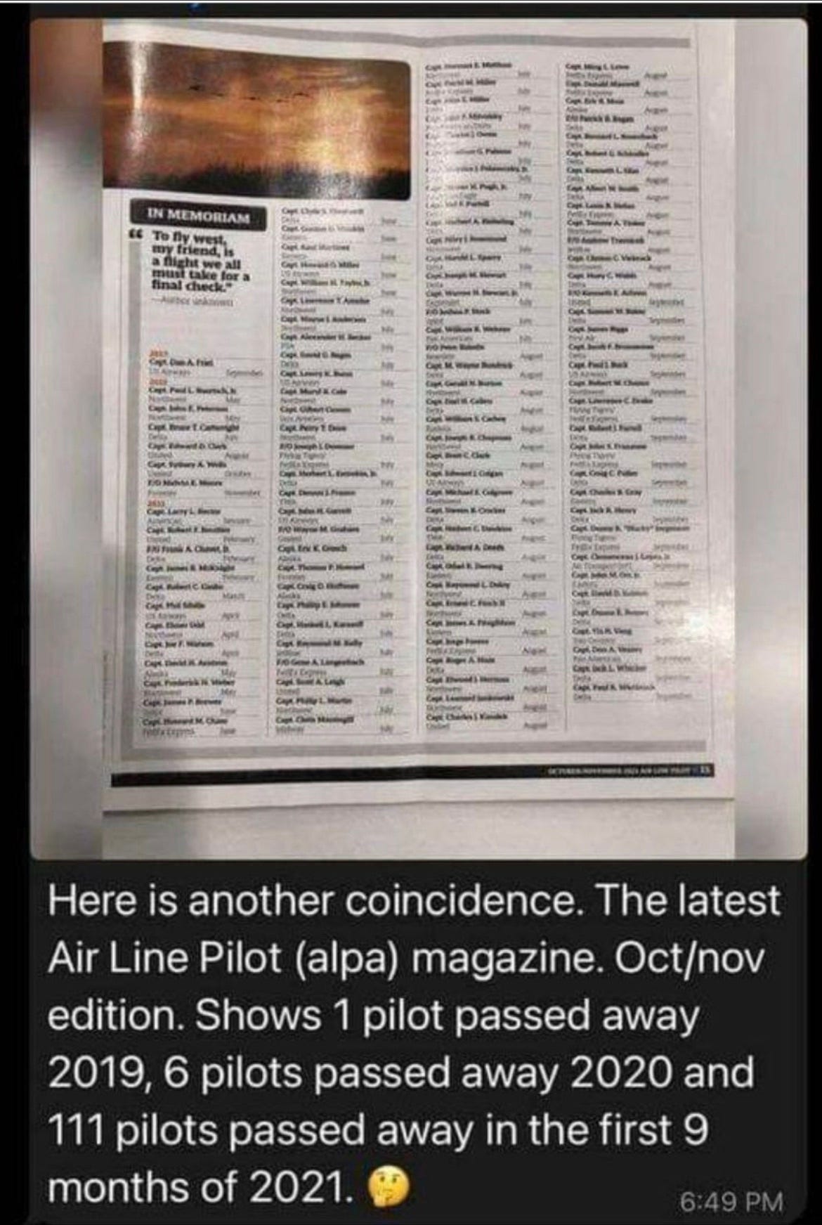 A list deaths published in the Air Line Pilot Association magazine shows that most of the deaths in 2021 happened after the vaccines rolled out. Are dead pilots trying to tell us something?