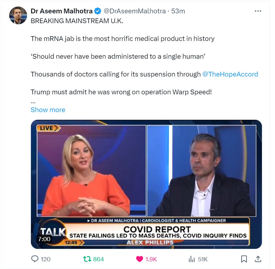 Consider that thousands of doctors are calling for a halt to these shots because they see how deadly they are like my friend cardiologist Aseem Malhotra who lost his father from the COVID vaccine: