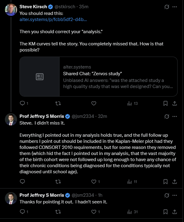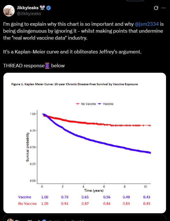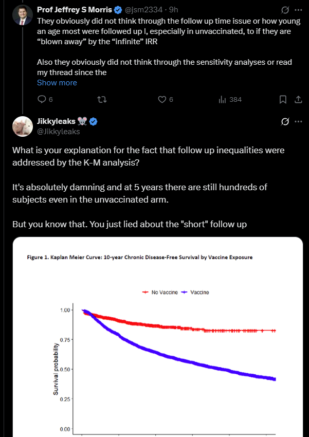 Here’s the key part of the exchange first when Morris critiques a comment by an epidemiologist, then Jikky schools him on the K-M plot.