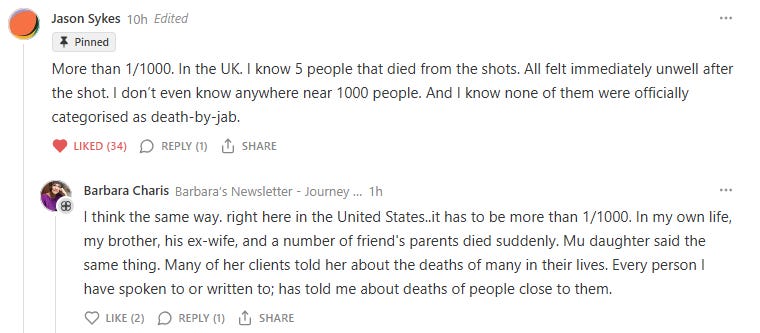 More than 1/1000. In the UK. I know 5 people that died from the shots. All felt immediately unwell after the shot. I don’t even know anywhere near 1000 people. And I know none of them were officially categorised as death-by-jab.