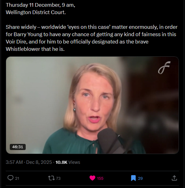 Barry Young, who leaked anonymized New Zealand health data showing the COVID vaccines were killing people, goes on trial on Dec 11, 2025 in the Wellington District Court at 9am. Please come there and support him!!! This is a pre-trial hearing (judge alone).
