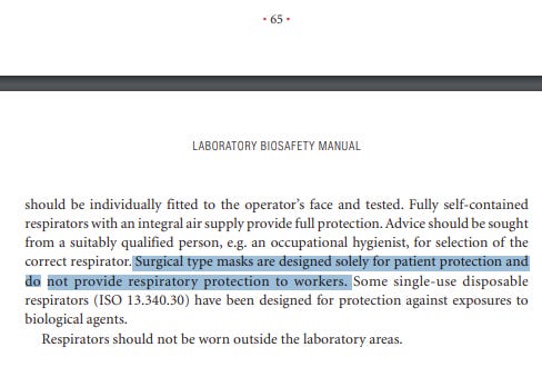 Not surprising at all. If you read the WHO 2004 “Laboratory Biosafety Manual” (Third Edition) it says, “Surgical type masks are designed solely for patient protection and do not provide respiratory protection to workers.”