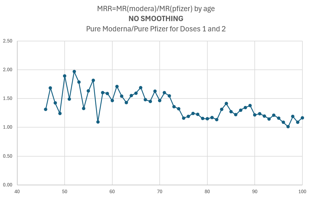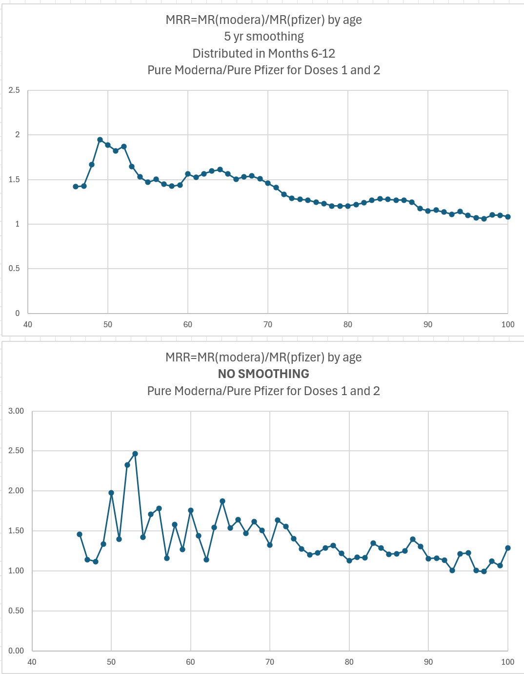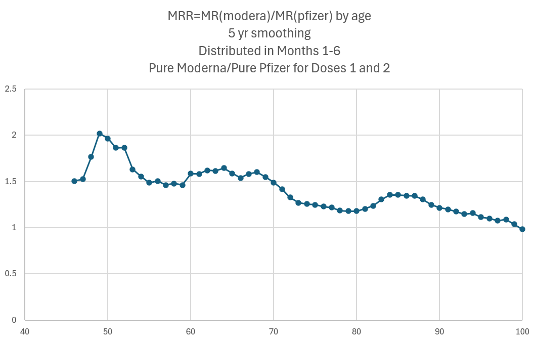 The bottom line is that he admits that he unable to explain why Moderna has a consistently higher MRR if the Moderna vaccine is safe, but he believes there must be a confounder that explains it.