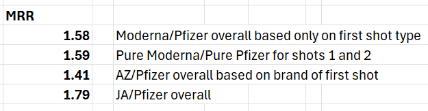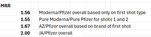 The MRR is defined as the MR (Moderna)/ MR (Pfizer). This is an absolute mortality ratio, not an excess mortality ratio.