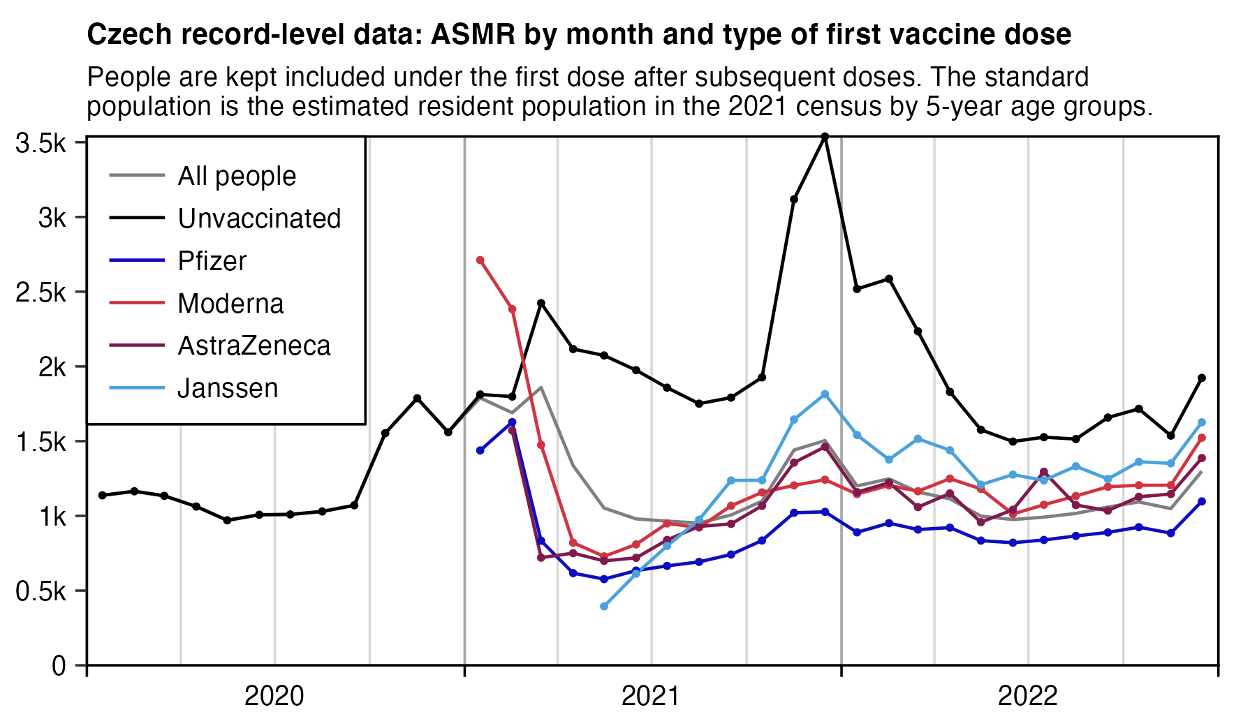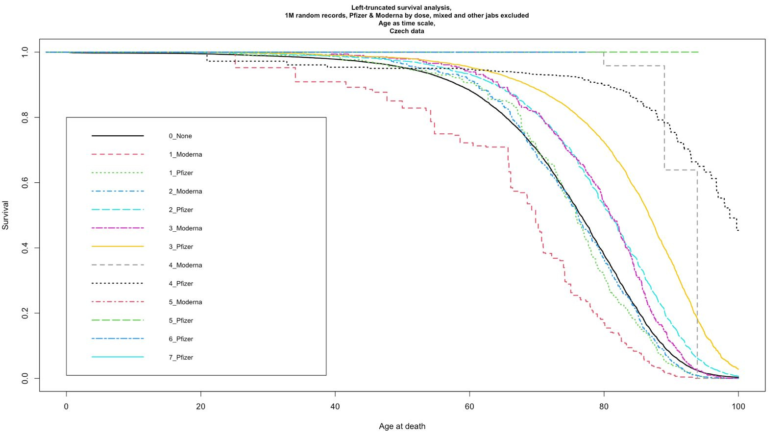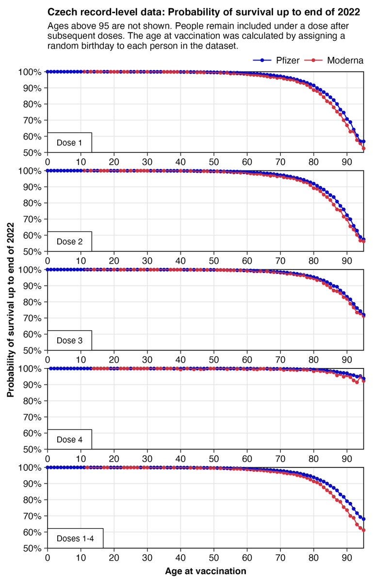 For example, for ages 46-69 who got two shots of Moderna vs. two shots of Pfizer in 2021 in the Czech Republic, there is over a 50% higher risk of death measured over a 1 year time window since the time of the shot as shown in the chart above.