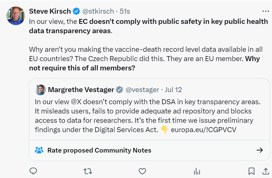 “Using Moderna to Pfizer ratios, Steve Kirsch demonstrated that Czech Republic record-level source data provides reasonable belief that COVID vaccines are killing people. Government officials have a legal duty to immediately and earnestly investigate these findings and halt COVID "vaccines" for the safety of their citizens.”