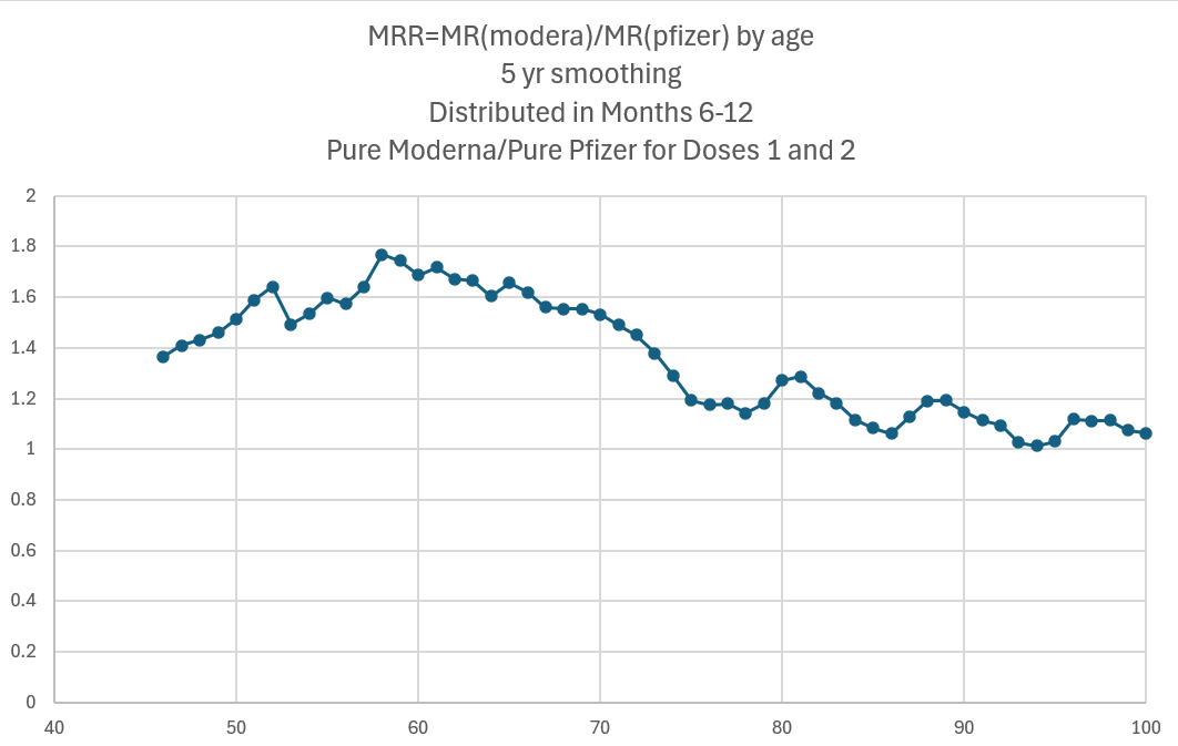 I wrote him an email urging him to focus on the big picture: what is the confounder explaining why the MRR is higher for Moderna in every single age group where there is sufficient data (there are 40 of them and Moderna loses 40 out of 40).
