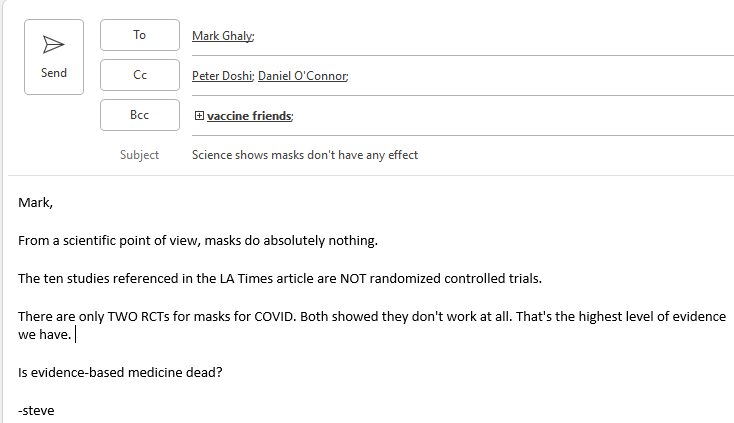 Folks, any effect size of masks, if there is one, is TINY. It is too small to measure in the big RCTs. There is no possible way to see a benefit without a really good and really big RCT. You will never see it otherwise. That’s what science says.
