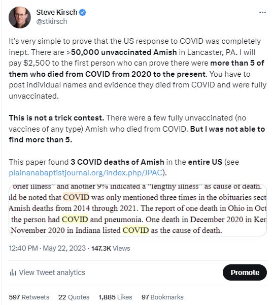 To drive that point home with people, I am making a $2,500 offer to the first person who can find more than a handful of unvaxxed Amish who died from COVID in Lancaster, PA during the entire pandemic.