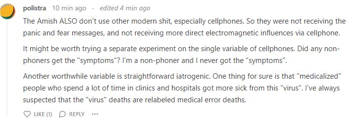 The Amish didn't lockdown, social distance, mask, or take a vaccine. It was business as usual. Few died. I offered $2,500 for anyone who could name >5 Amish who died. No takers. Just excuses.