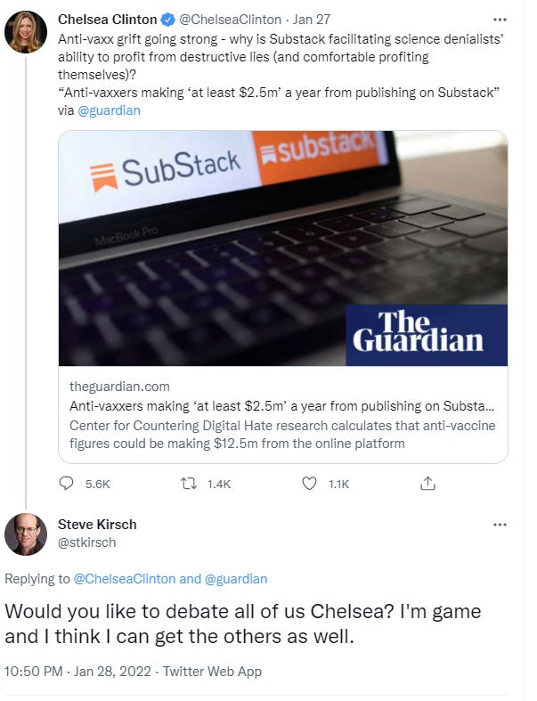 Here are my offers to debate Imran Ahmed and Chelsea Clinton. You can click these and see if they reply. My advice: don’t hold your breath on that one.