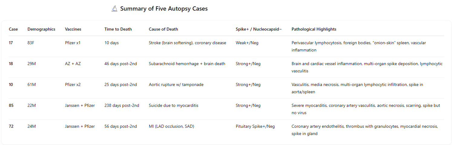 Using just 5 autopsies chosen at random, there is no question that the vaccines are at fault here. All these cases had a common damage profile that is rarely or never seen before the COVID shots in anyone.