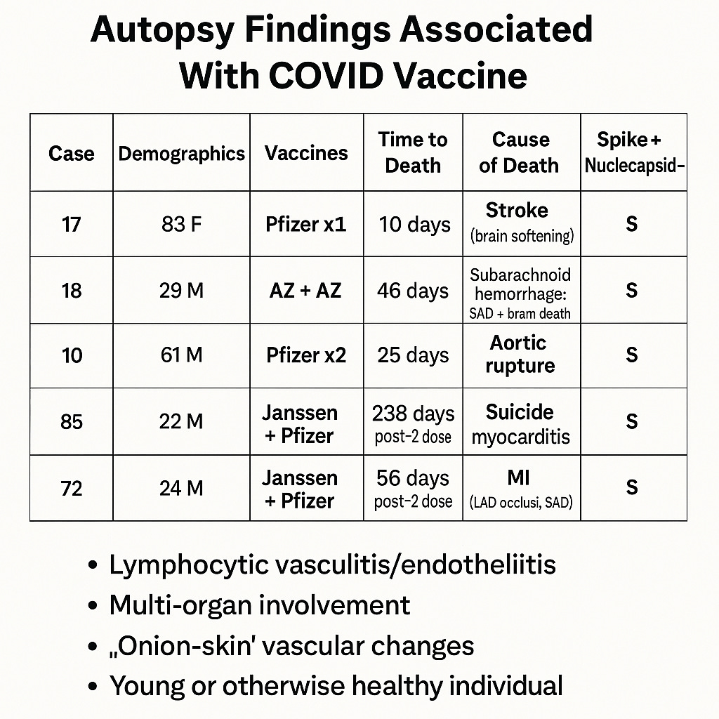 The recurring theme is multi-organ immune-mediated injury with vascular focus, spike protein presence, and no evidence of prior COVID-19 infection, creating a pattern highly suspicious for a vaccine-mediated process.