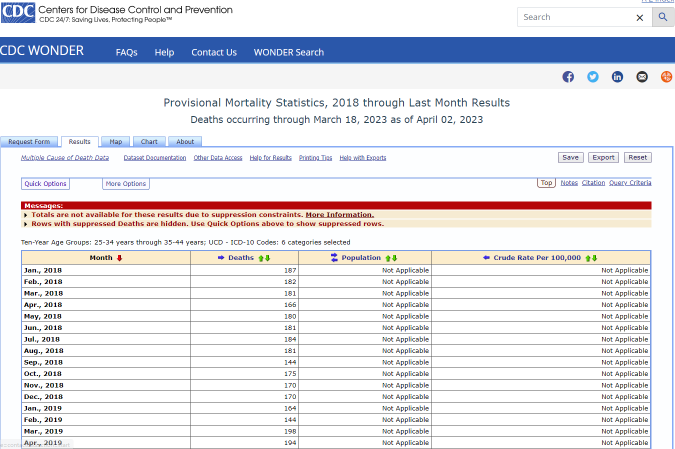 The data from the CDC query on I21 deaths for 25-44 year olds