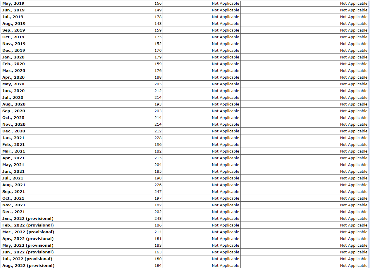 What’s really interesting are the two peak months for deaths in the query: Sept 2021 (247 deaths) and Jan 2022 (248 deaths).