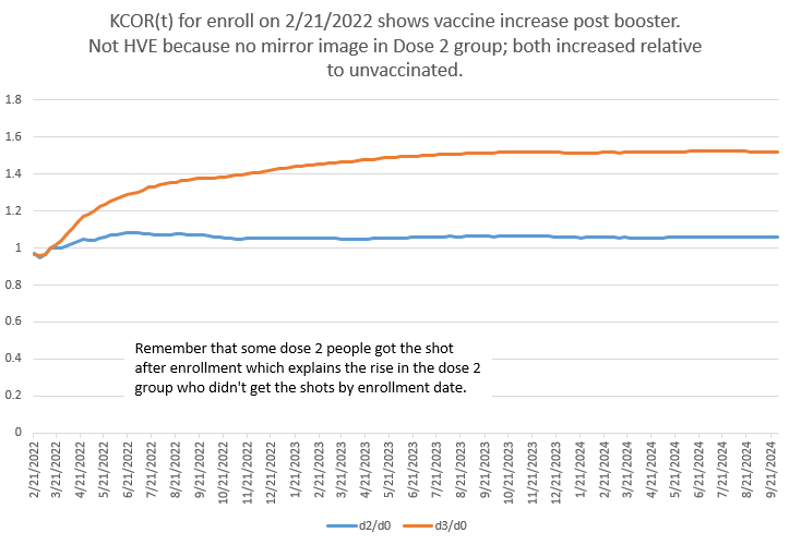 KCOR is the ratio of the slope-adjusted cumulative hazards between cohorts, normalized to a short baseline window after enrollment. Here is a KCOR curve for all ages post booster showing the booster shots were net harmful: