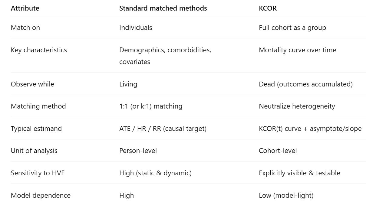 KCOR takes a different approach by matching the cohorts based on their collective outcomes (e.g., hazard(t) shape of the entire cohort) rather than the individual attributes of each person (e.g., 1:1 matching by age, education, sex, comorbidities).
