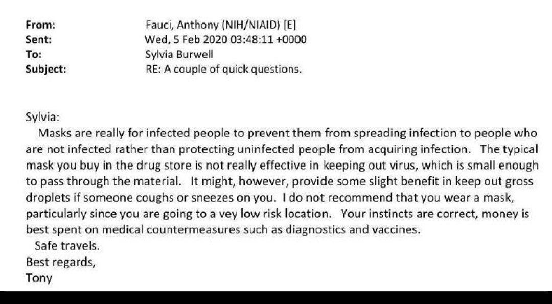 Feb 5, 2020: Fauci says masks basically don’t work. It won’t protect people from getting the disease. According to him, it is only useful if you ARE already infected.