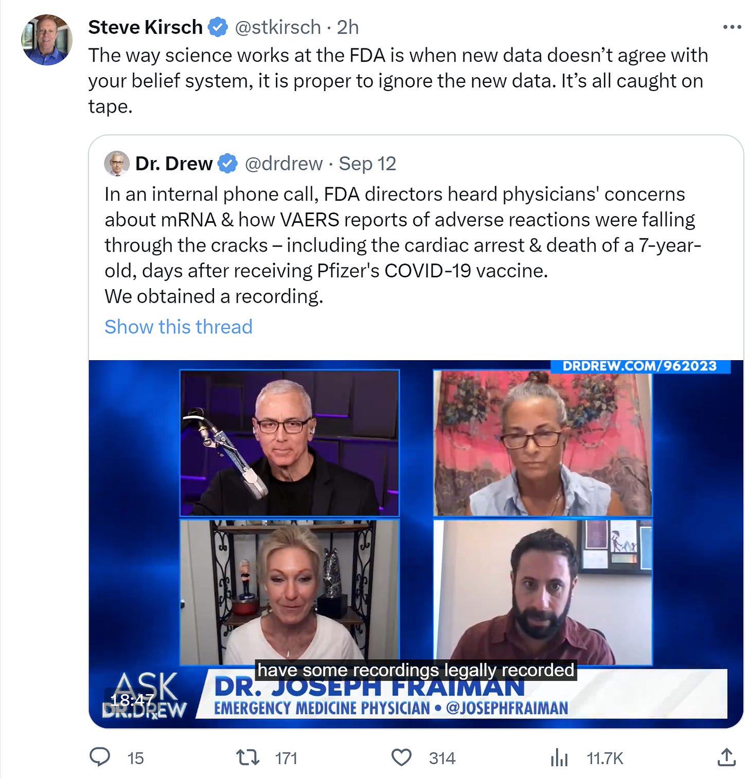 Watch this video. Basically, in a meeting with top FDA officials including Peter Marks that was secretly (but not illegally) recorded, the FDA experts admit that if the data doesn’t support their narrative (even if it is from a gold standard randomized controlled trial), they ignore it (listen starting at around the 4:00 minute mark).