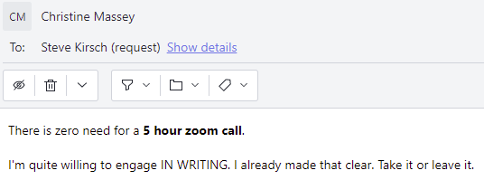 I responded to her open letter by offering up to a 5 hour zoom call with a few of my friends who do work in this area so we can settle the matter in one meeting. If she’s done early, we end early. I thought I was being generous with the time offered, but was accused of being disingenuous. The reason for 5 hours is having done this before on other topics, it takes hours, so I allow for plenty of time on both sides. Not offering sufficient time could be seen as “ducking” her challenge. She can bring as many people on her side as she wants but for something like this, I suggest a limit of 3 per side. If she wants less time, I’m fine with that!!! She can leave the room at any time if we are done early.