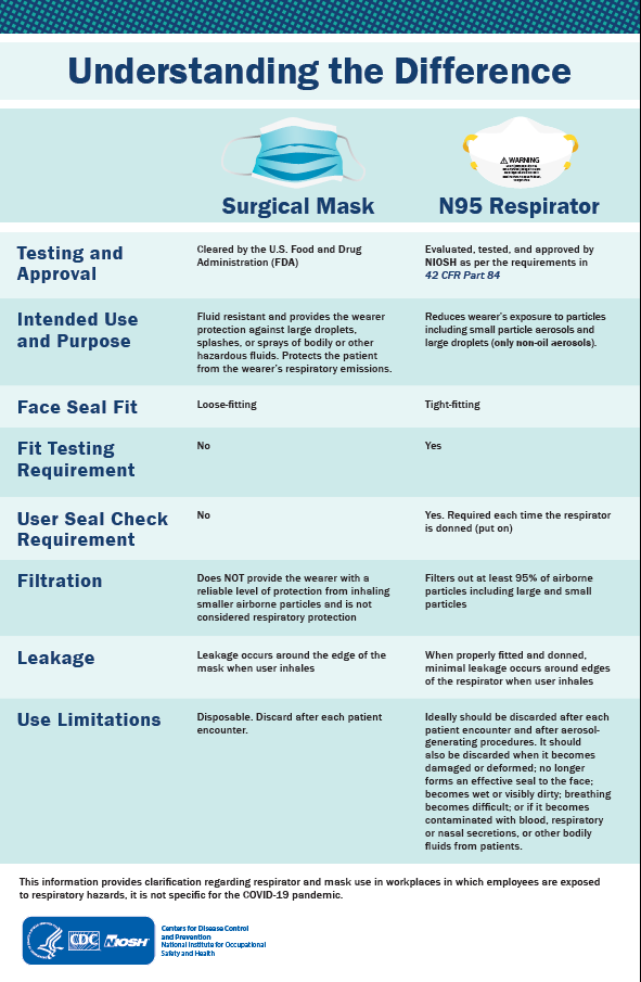 According to the CDC, surgical masks do NOT provide the wearer with a reliable level of protection from inhaling smaller airborne particles and are not considered respiratory protection (Source: CDC, published 8/12/21). Check out the filtration row.