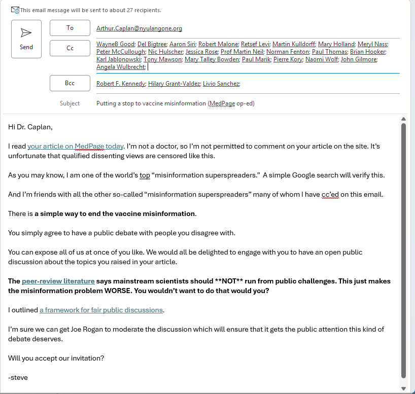I just sent this email below to him to give him an opportunity to be a world hero by agreeing to have an open public discussion with top worldwide influencers who do not share his view about vaccines. The purpose is simple: to put a stop to the disinformation crisis by making it crystal clear to the public who is telling the truth and who is not.