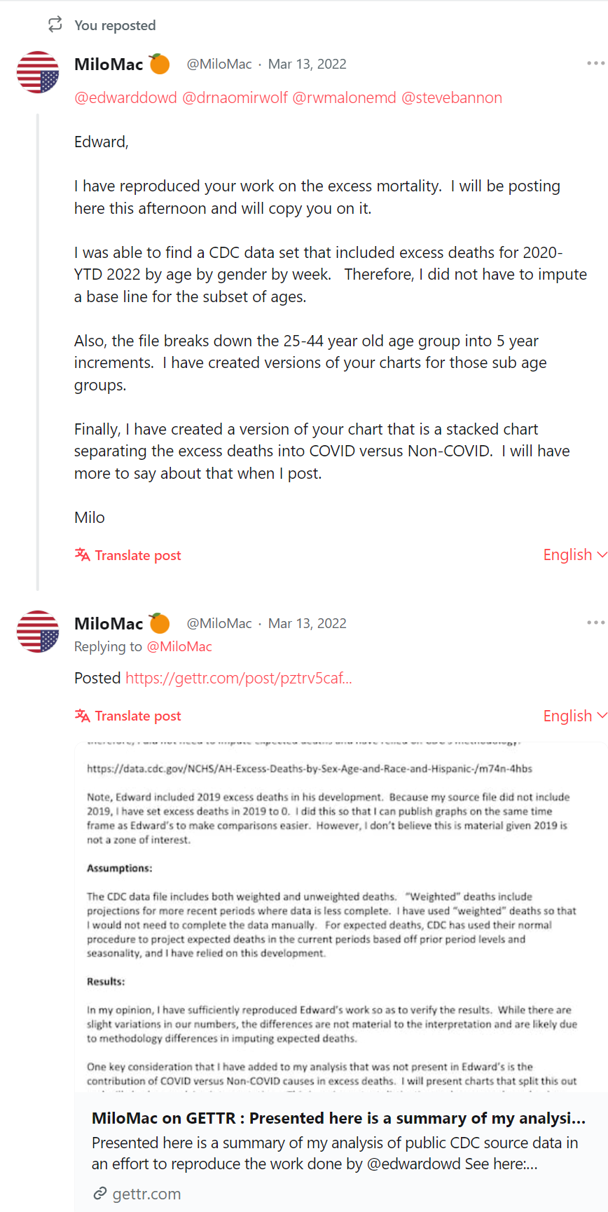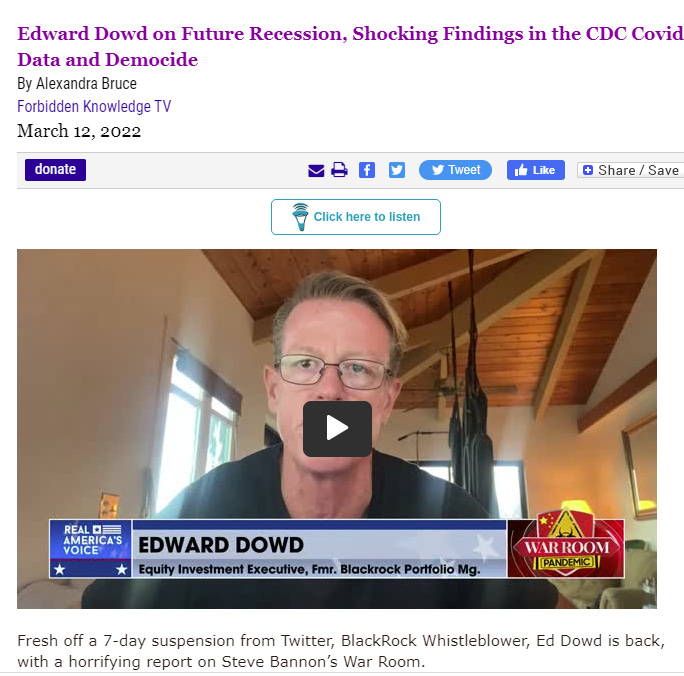 Someone sent me this article: Edward Dowd on Future Recession, Shocking Findings in the CDC Covid Data and Democide which describes his appearance on War Room.