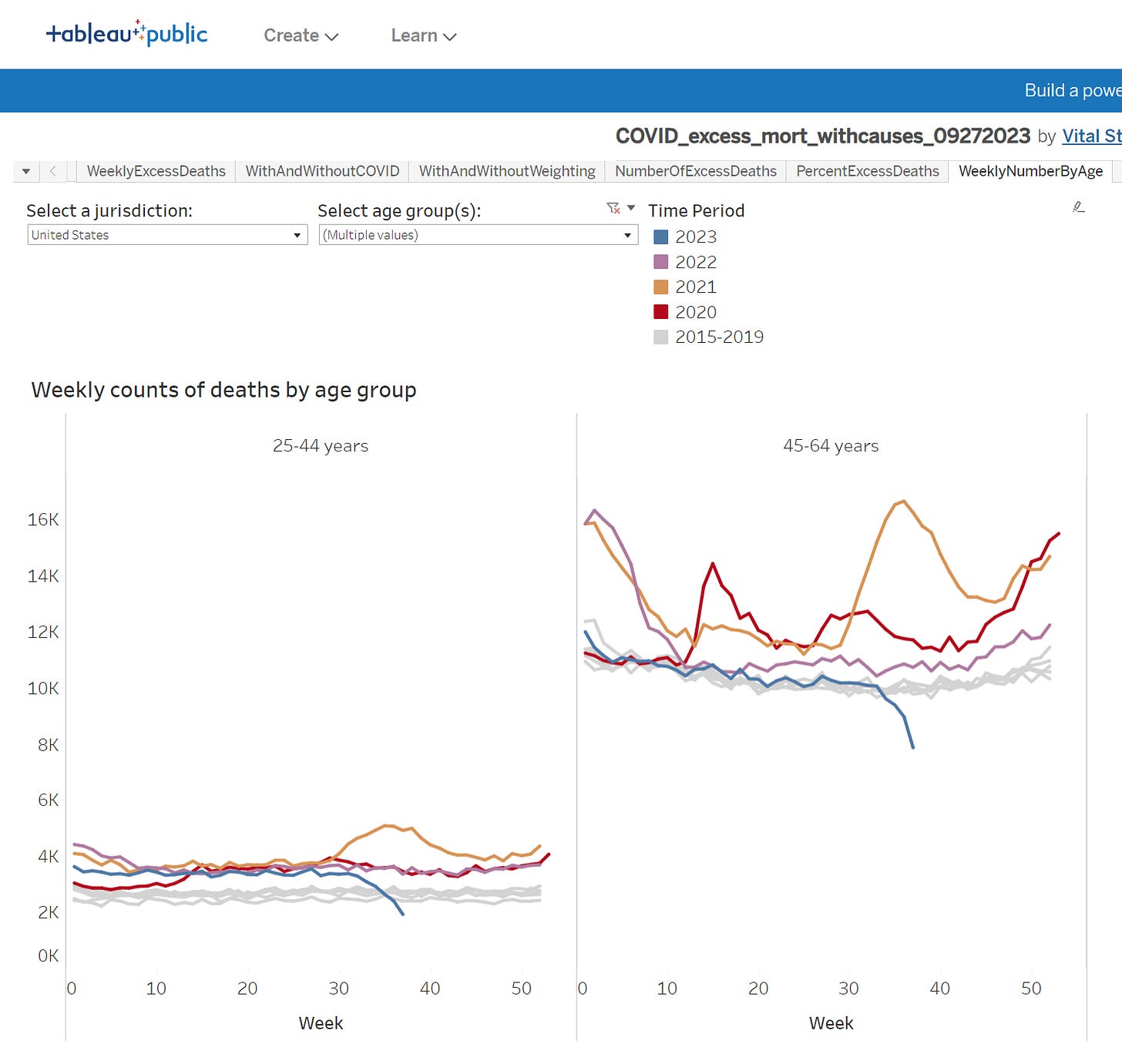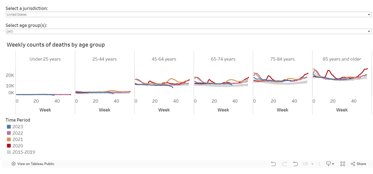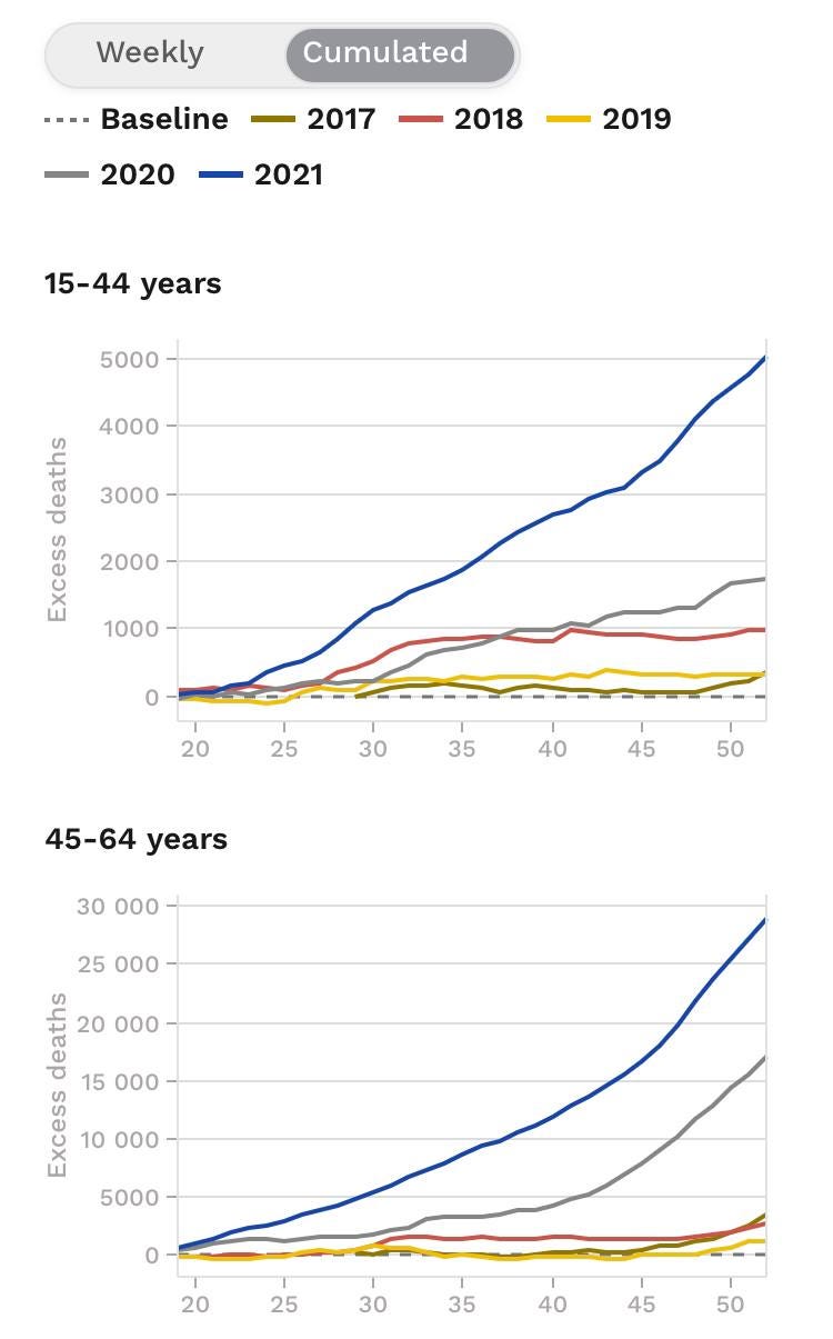The CDC page Ed referenced in his post is now archived an no longer being actively updated. But you can visualize from the historical data and verify that in 2021 in Q3 was a massive percentage increase in deaths for ages 45-64 and 25-44: