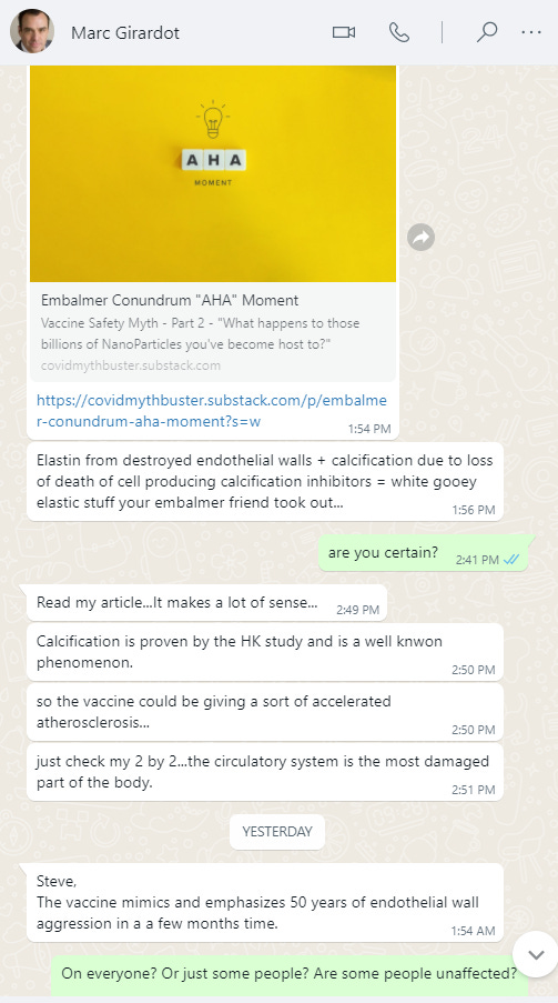 Here’s a conversation I had on WhatsApp with Marc Girardot. He believes that the vaccine can, in some people, age your arteries by around 50 years in a few months. This of course would accelerate death. Here’s an excerpt of our conversation: