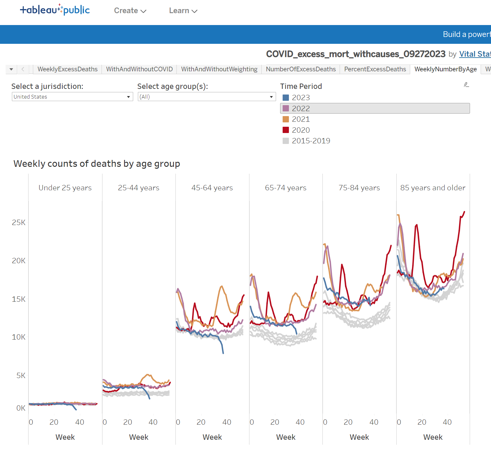 So for 25-44 year olds, in week 35, there are 3,558 deaths in 2020 and 2022, but 5072 deaths in 2021. Baseline is 2,729 deaths in the highest baseline year, so an 86% increase.