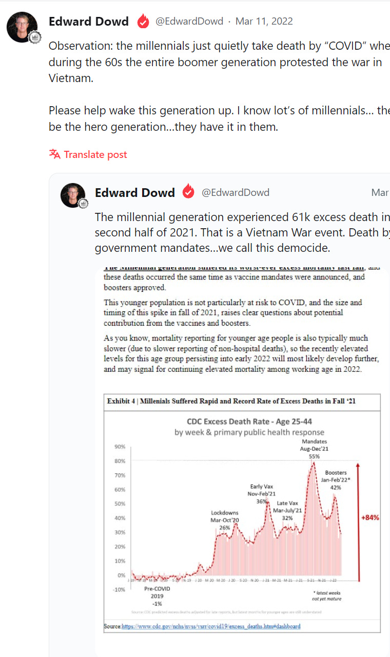 Ed Dowd: "Millennial age group, 25 to 44 experienced an 84% increase in excess mortality"
