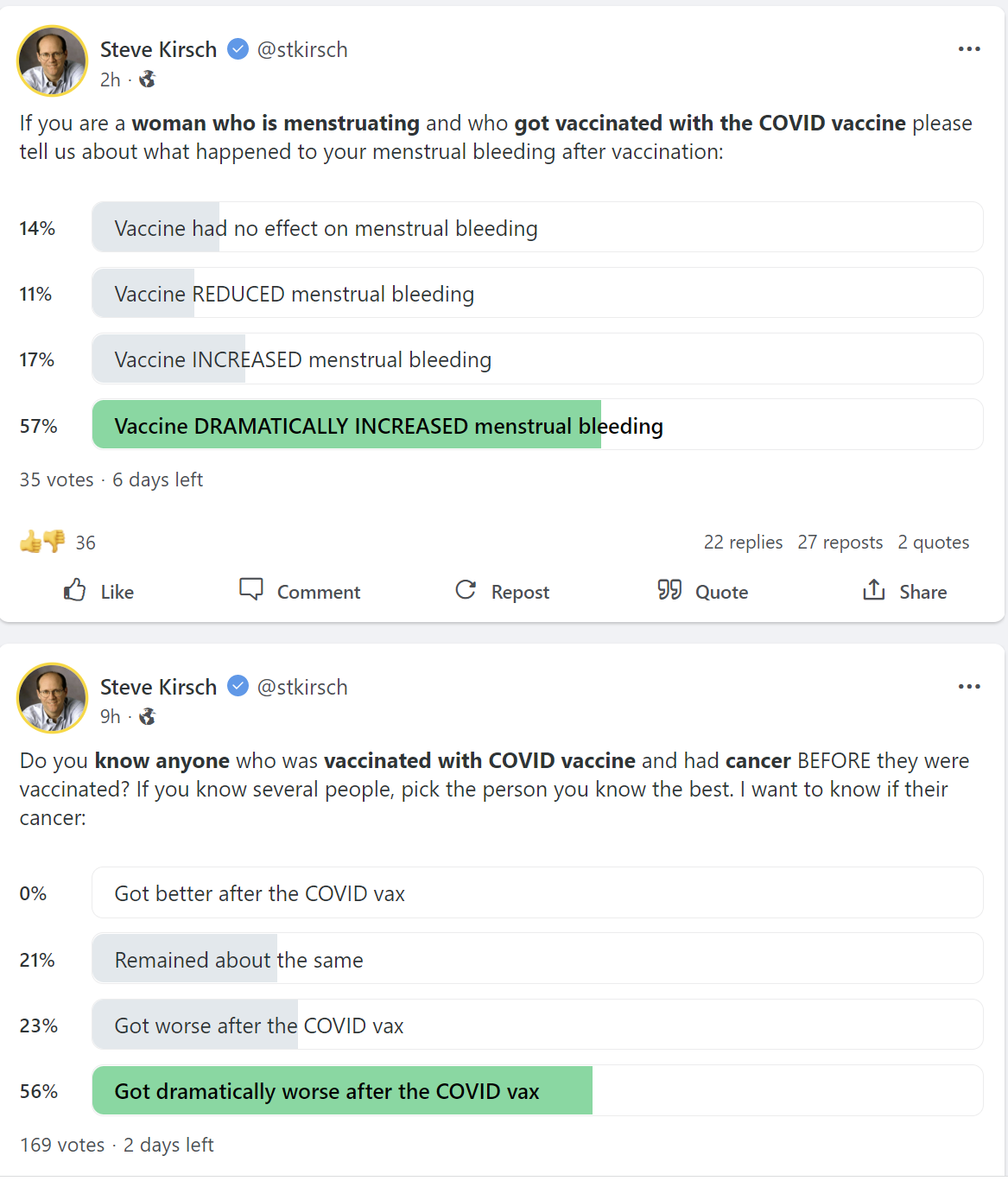 Here are two surveys run by VaccineTruth2 on Twitter. The first is the “Twitter version” of the Gab poll. It’s a Twitter version because you only get four choices and each line must be 25 characters or less.