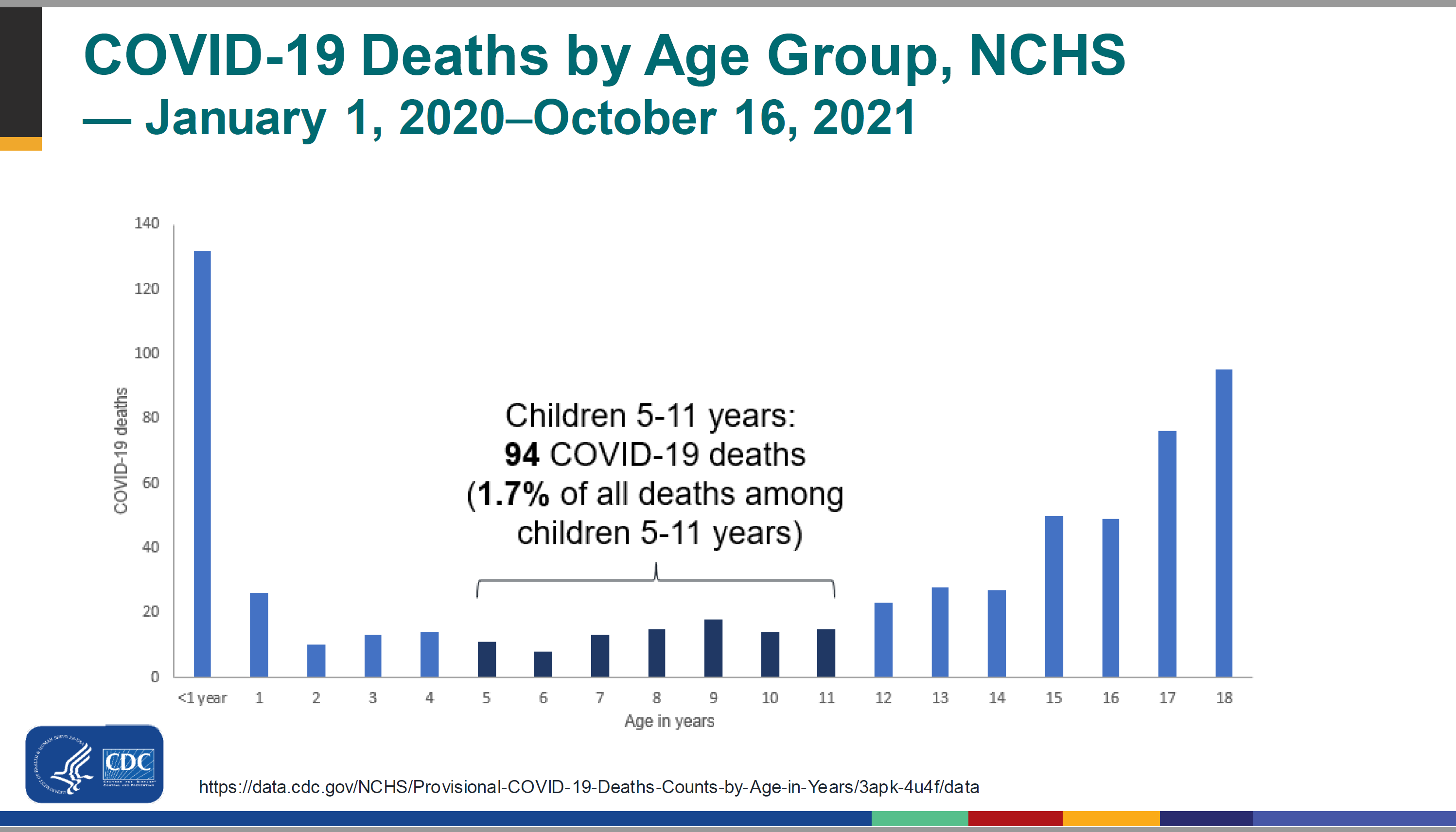 I just found out I was right. Here are the numbers right from the October 26, 2021 VRBPAC presentation (see slide 16) which show that just 1.75% deaths in this age group are caused by COVID. So my earlier 120X estimate which assumed a 5% COVID death rate…that’s wrong. I need to increase the 120X estimate by 5/1.75. We are killing 336 kids for every kid we would save if the vaccines are 100% successful. Wow.