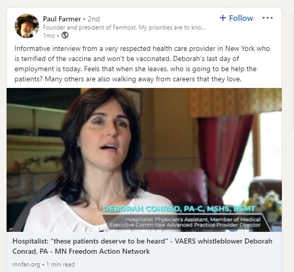 The message is clear: If you speak the truth, you will be pay the price. It is imperative that information that doesn’t align with the “narrative” be suppressed. This is why doctors don’t speak out. And it’s why I had to quit my job in high tech to speak out as well.