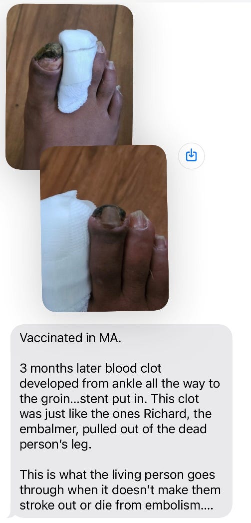 The big news is that she found the unusual clots in 93% of the last 30 people who she embalmed. This is significant because she isn’t selective about who she embalms.