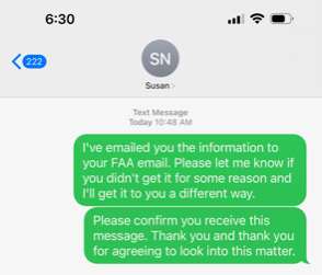 At 10:15am on Saturday Jan 21, 2023, I made a call to the private cell phone of the Federal Air Surgeon of the FAA Dr. Susan Northrup. The call lasted 2 minutes.