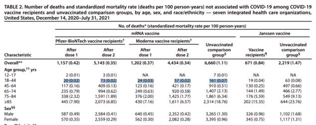 The non-COVID mortality rate can’t vary based on which vaccine you choose to get; any healthy vaccinee effect should be independent of the manufacturer of the vaccine. And the reduction in mortality rate because you chose a vaccine cannot be caused by the vaccine; vaccines don’t reduce all-cause mortality. And the cohorts are too large in size to have a mortality difference of what was observed (up to an 80% reduction from normal mortality), so this wasn’t simply a non-statistically significant result.