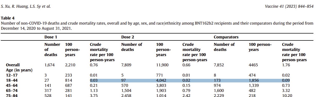 If the paper were true of course, we'd see a DRAMATIC drop in all-cause mortality numbers in the 18-44 group. We don't. The effect (a drop from .09 uvaxxed to .02 in the vaxxed) is huge.
