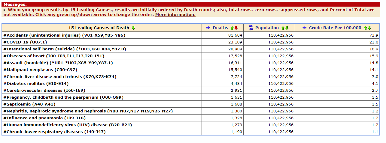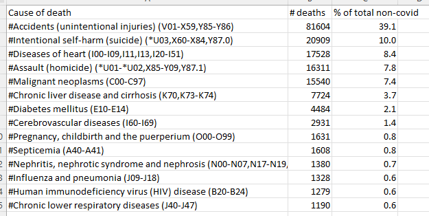 Here are the 15 leading causes of death in 2021 in 20-44 age group which account for 198,636 out of a total of 232,113 total deaths: