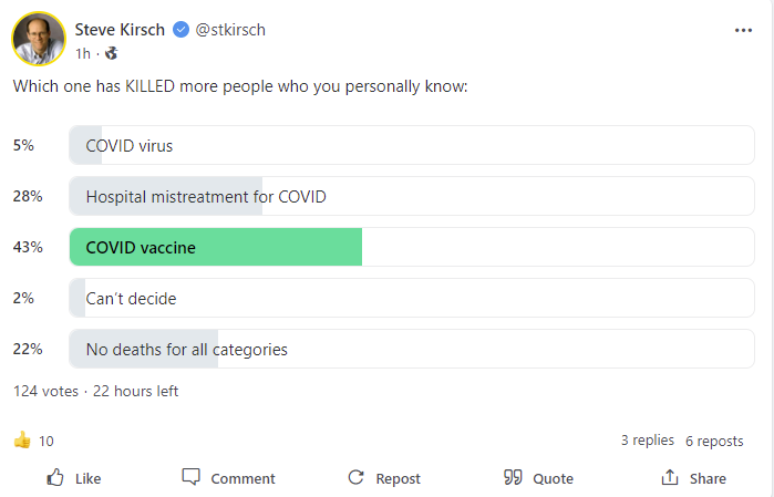 Surveys of my followers show that COVID vaccines are more dangerous than COVID HOSPITAL PROTOCOLS which in turn are much more dangerous than the COVID virus. This applies to both deaths and injuries. This will be repeated using an outside polling firm.