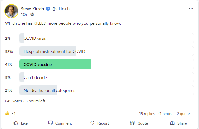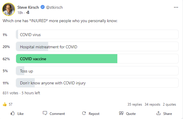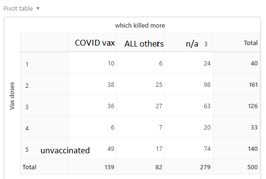Unless I missed something, they are totally screwed. There is simply no way to “spin this” in your favor. This survey is simple to replicate and it completely destroys the “safe and effective” narrative because there is no way to “spin” the results in your favor. It’s devastating.