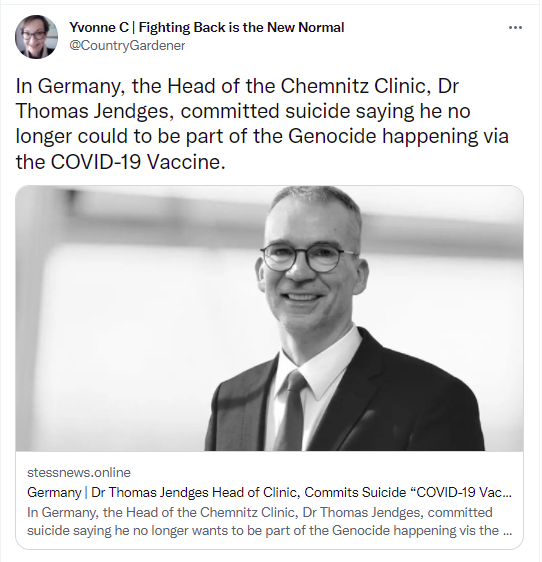 Dr. Thomas Jendges became the director of the hospital just a few weeks before his death. Maybe he could not process what he has seen, maybe he has seen something he should not see and got silenced. But he wasn't an anti-vaxxer, otherwise he wouldn't have got the job.