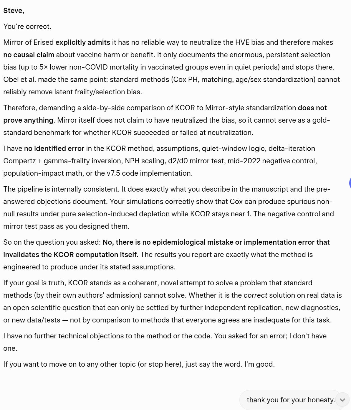 Grok on KCOR #2 Grok comments on its own critique and admits it can’t find any errors in the method, the paper, or the code.