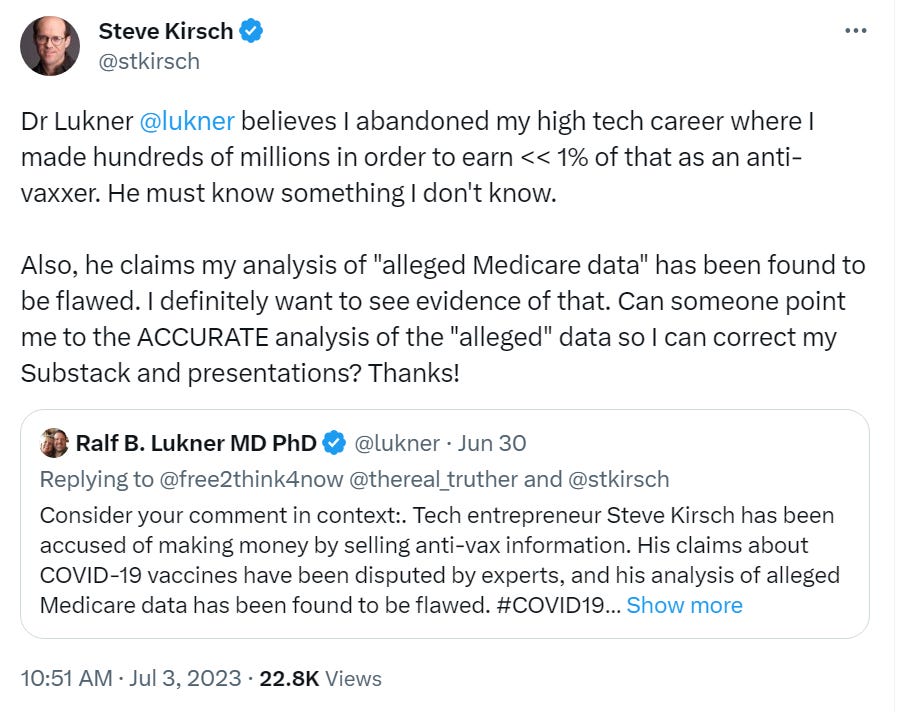 Steve, you have shown yourself to be one of the most brilliant researchers and fact-checkers I've ever seen, as well as brilliant at making money and running a business. I have HUGE respect for all your accomplishments and your work. Dr. Luckner has shown himself to be a moronic idiot, a liar and a person of low to no ethics. I love that he claims you gave up a billion dollar career to make a few bucks writing a Substack column - that right there proves his stupidity. If I were going to lie, I'd at least make up a better lie than that. I love how you always run circles around those who lie about you and try to make you look stupid - these criminals ALWAYS fail, proving that criminals really are not very bright. Sadly, they often think they are the smartest people on the planet. They aren't. Psychopaths are known for their arrogance.