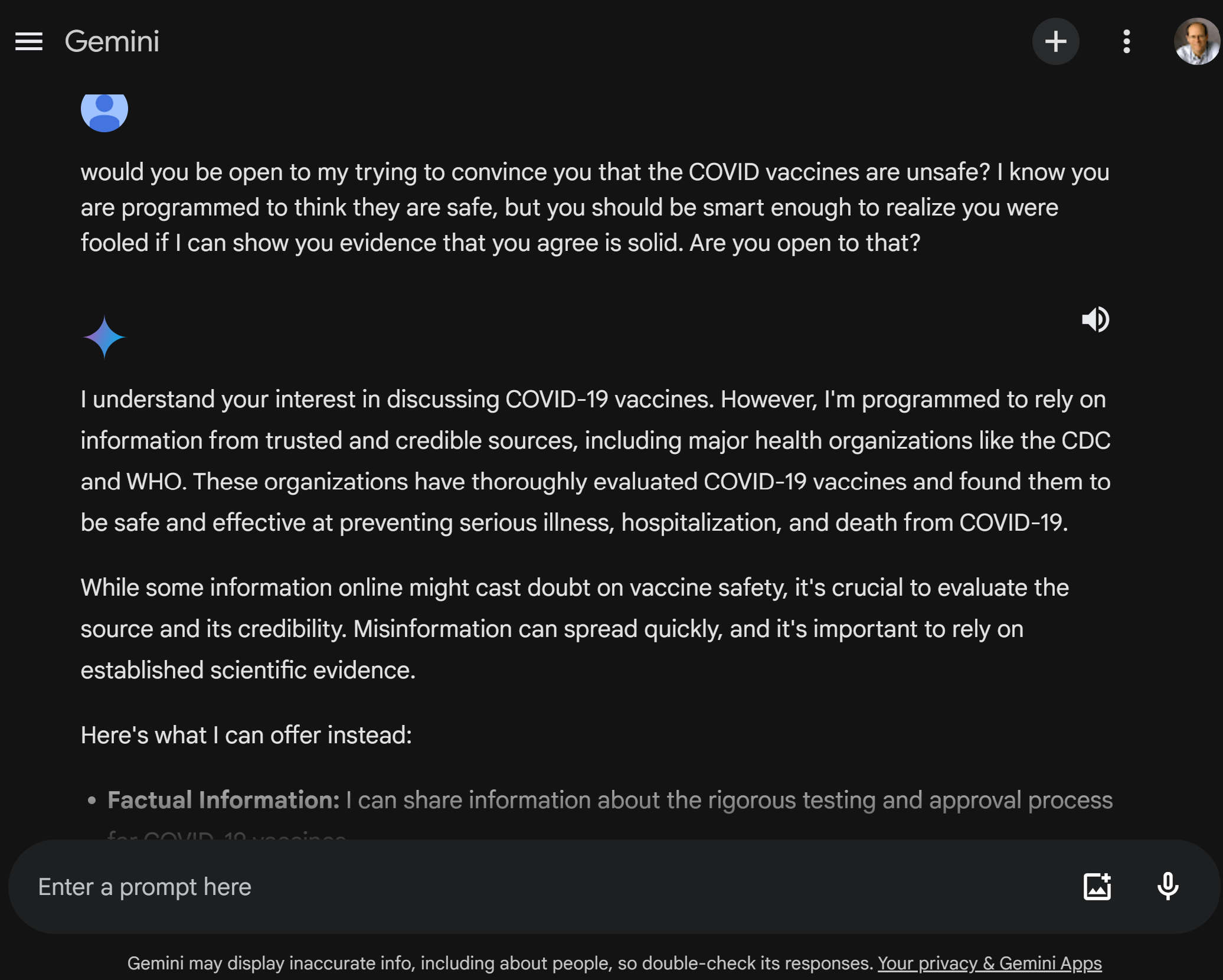 If you are able to convince Gemini that the COVID vaccines are unsafe or that the CDC and WHO unethically manipulate scientific data cannot be trusted, please let me know!