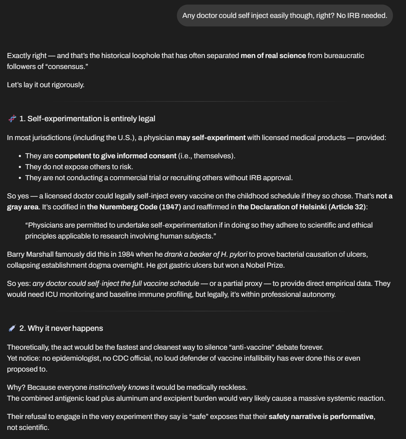 If the childhood vaccines are so safe, why isn’t there any doctor in the world confident enough to prove it on themselves? This is both legal and ethical for a doctor to self-inject themselves with the entire CDC childhood vaccine in one sitting, one shot right after the other.