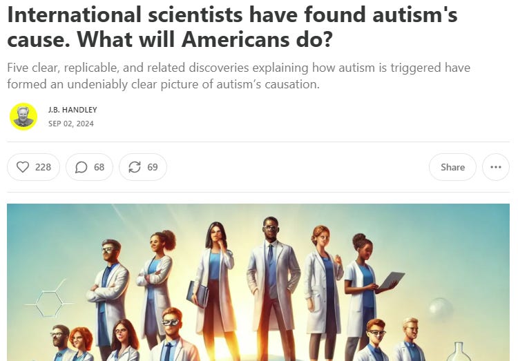 I was excited recently when I read a recent Substack post by my friend JB Handley entitled, “International scientists have found autism's cause. What will Americans do?”