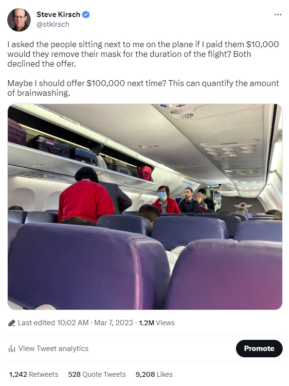 On a recent Southwest flight, I offered $10,000 to the people sitting next to me to remove their face masks for the remainder of the flight. No takers. This shows you how strong the brainwashing is.